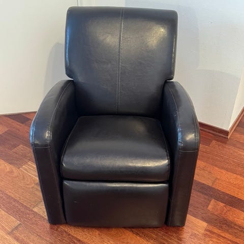 "Lenestol til barn i mørk brun farge. Stolen har polstret sete, rygg og armlener, og er tilpasset barnestørrelse. Den har uttrekkbar fotskammel som gir mulighet for en mer tilbakelent sittestilling. Trekket fremstår som et glatt materiale i mørk brun tone. Undersiden viser noe skade i stoffet, som fremgår av bildet. Egnet som egen stol til barn på barnerom, stue eller lekeområde". KI-generert tekst.
