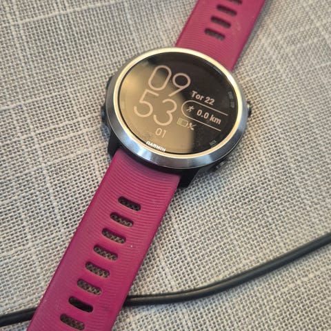 Garmin Forerunner 235 pulsklokke i svart og rød farge. Klokken har rund skjerm og integrert optisk pulssensor på undersiden. Medfølgende ladesnor med USB-tilkobling vises på bildene. Reimen er perforert silikon/gummi med to farger for bedre ventilasjon rundt håndleddet. (Ikke orginal reim) Egnet til løping og annen trening der man ønsker registrering av puls og aktivitetsdata.