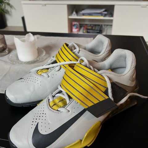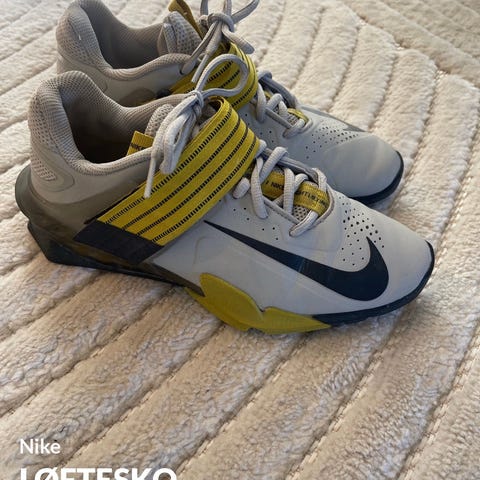 Nike løftesko, brukt kun to ganger. Veldig fine sko som sitter godt og tett inn til foten. Kjøpte dem nye, siden jeg sluttet med tungt løft velger jeg å selge de. Passer til fotlengde 27,80cm-28cm.