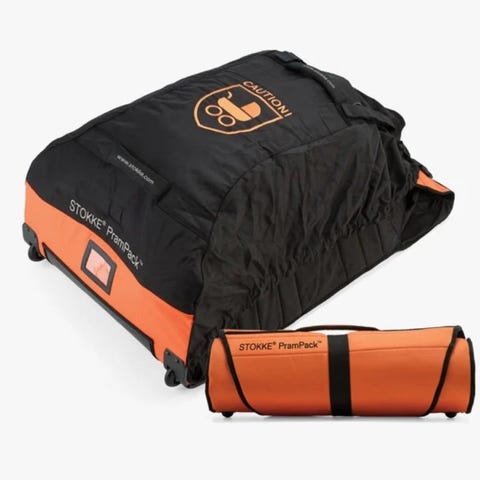 Stokke PramPack reisebag til barnevogn i oransje farge. Bagen er laget i slitesterkt tekstilmateriale med svarte stropper og spenner for sikker lukking og justering. Egnet for transport og oppbevaring av barnevogn under reise, og kan rulles sammen for enklere håndtering når den ikke er i bruk.