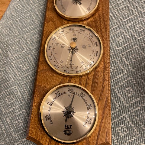 Baksiden er i messingfarget metall med oppheng for veggmontering og merking «Made in Western Germany». Egnet til innendørs måling av lufttrykk og værendringer.