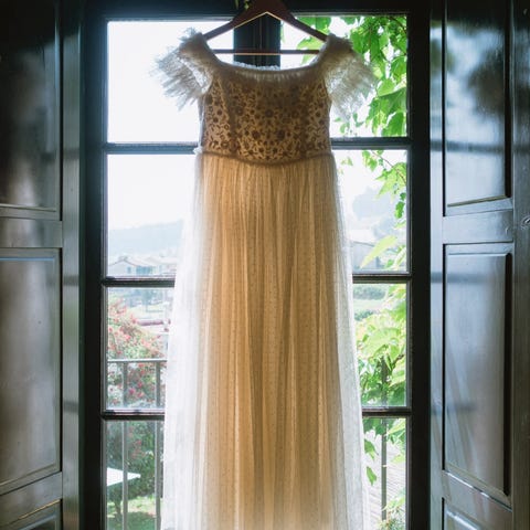 Kjolen sitter utrolig fint på kroppen og passer perfekt til bryllup, forlovelse, fest eller andre spesielle anledninger. Den har off-shoulder design og vakre blondeermer som gir et eksklusivt og luksuriøst uttrykk.