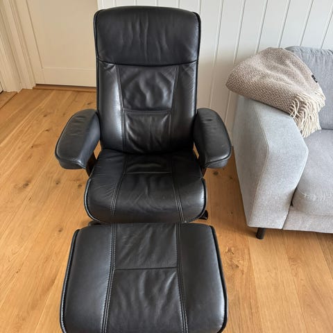 Sort lenestol i skinn med puff
