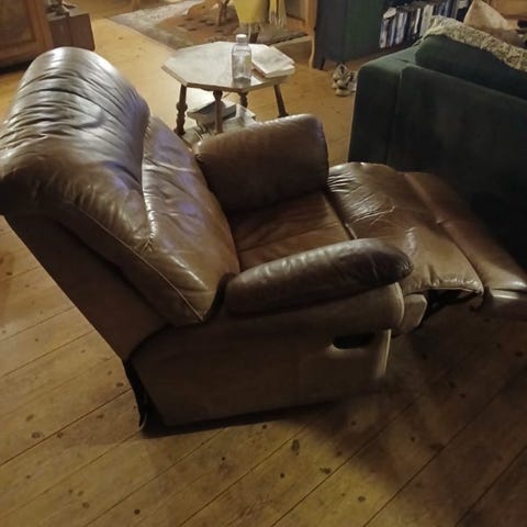 Selger en flott og god lenestol å sitte i . Kan både svinge 360grader og legges bakover.