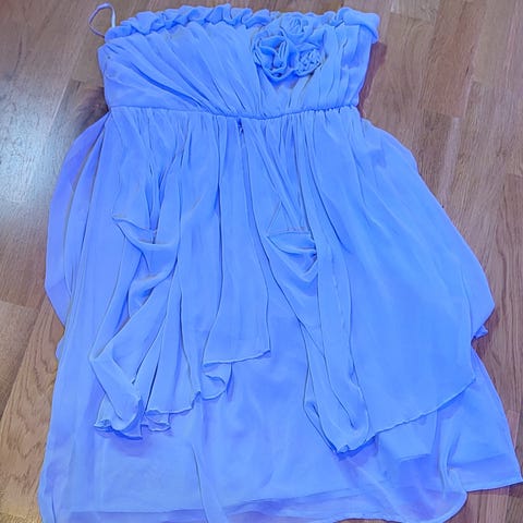 festkjole for dame i størrelse 38. Kjolen er lilla og laget i polyester. Overdelen har tekstur og dekorative detaljer, mens skjørtet er lett og lagdelt med mykt fall. Egner seg til fest og andre anledninger der en kort, feminin kjole passer.