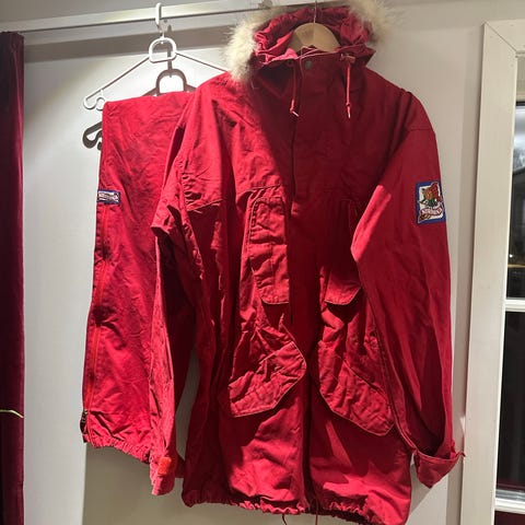Selger et ikonisk Norrøna-sett fra 1994 – anorakk og bukse i klassisk rød farge. Dette er skikkelig retro norsk friluftsutstyr med solid kvalitet og tidløst design.