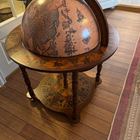 Selger et dekorativt og praktisk globus barskap i klassisk/antikv stil. Globusen åpnes og gir plass til flasker og glass, med flott illustrert interiør og kartmotiv utvendig.