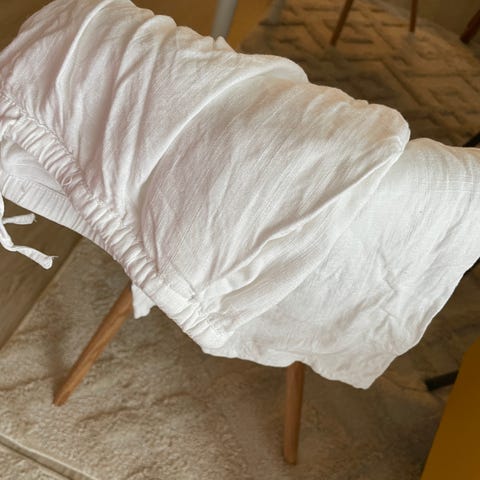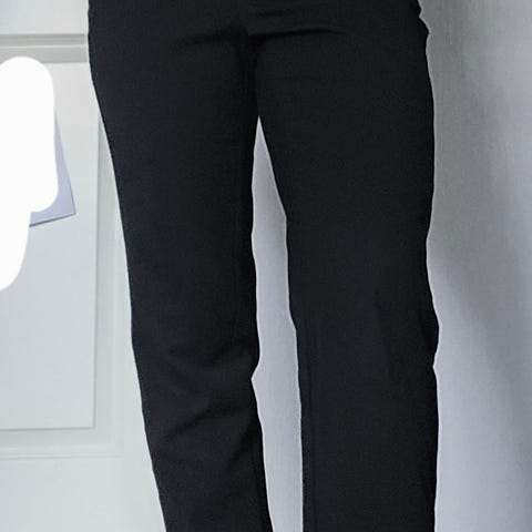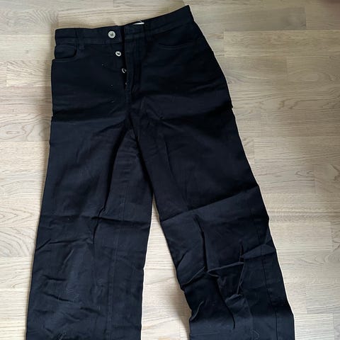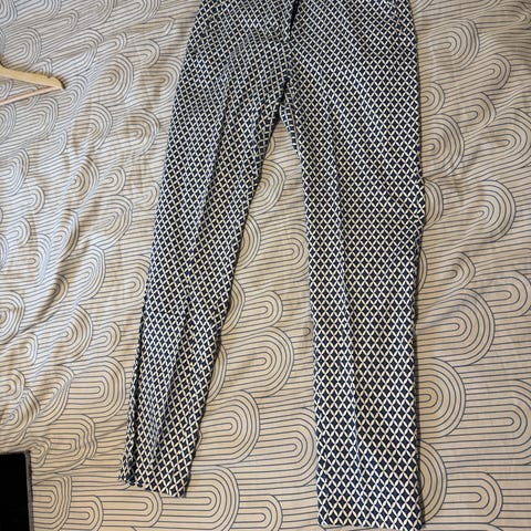 Svart, behagelig bukse fra H&M i linblanding, størrelse S. Veldig behagelig stoff og passform. Lukkes med knapp, og har lommer i sidene, samt jukselommer bak. Strikk i ryggen for behagelig passform. Lite brukt da jeg har for mange svarte bukser..