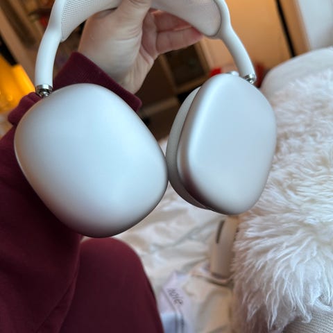 Apple AirPods Max hodetelefoner i sølv/ hvit farge. Over-ear hodetelefoner med justerbar hodebøyle og øreklokker i mykt materiale. Leveres med Smart Case som beskytter hodetelefonene under oppbevaring og transport. Egnet for trådløs lytting til musikk, film og samtaler med kompatible Apple-enheter og andre enheter som støtter Bluetooth-tilkobling. Kjøpt for noen måneder siden og er nesten ikke brukt