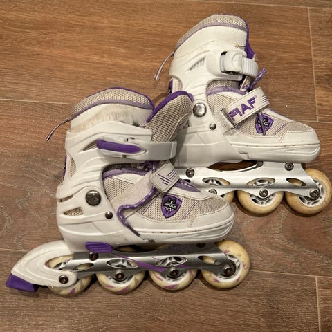 LAF rulleskøyter for barn i størrelse 31. Modellen har hard yttersko med justerbare spenner og borrelås for god passform. Rulleskøytene har fire hjul i rekke med bremse bak på den ene skøyten. Fargekombinasjon hvit og lilla. Egnet til bruk på jevne underlag for lek og enkel trening på rulleskøyter.