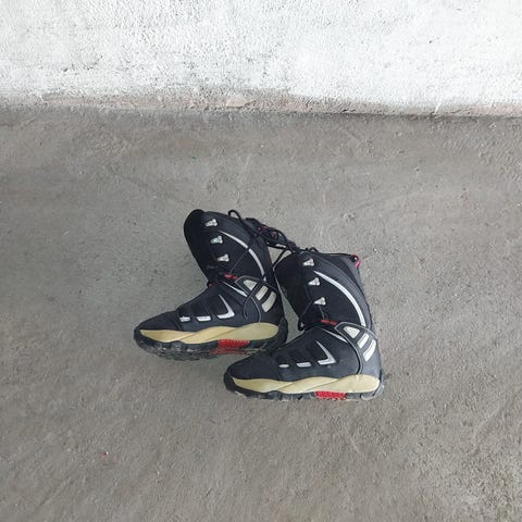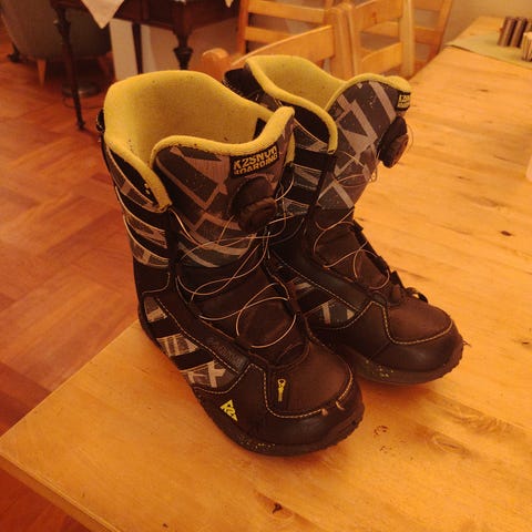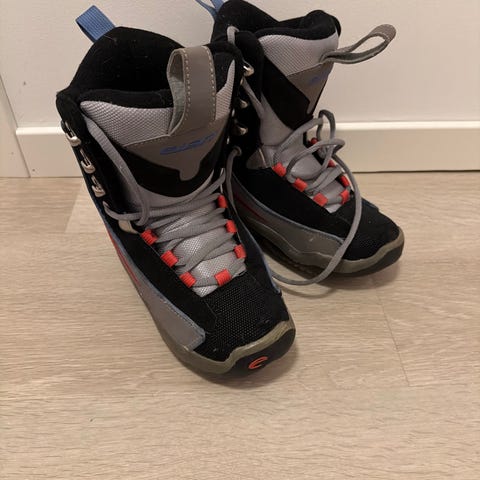 Støvlene har høyt skaft med snøring foran og grov såle som gir godt grep på snø og is.