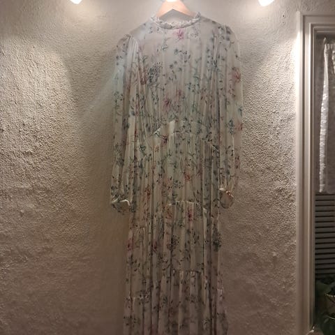 Vila sommerkjole for dame i størrelse S. Kjolen er i bomull og har et blått blomstermønster på lys bunn. Modellen har lange ermer, v-utringning og avtagbart knytebelte i livet. Lengden går ned mot ankelen, og passformen er rett med markert midje. Selges kr 350,-.