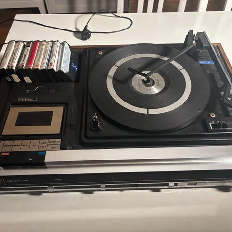 Trekker kassetten, teller og spoler. Vi greide imidlertid ikke å få lyd, men forhåpentligvis vil rett kompetanse fikse dette. Selges som den er.