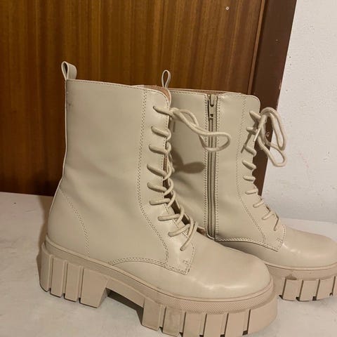 Zara boots i størrelse 37. Støvlettene har kraftig, mønstret såle og er i en beige farge. Modellen har snøring foran, glidelås på siden og justerbar rem med spenne øverst på skaftet. Egnet til hverdagsbruk i sesonger der man ønsker lukkede sko med grov såle.
