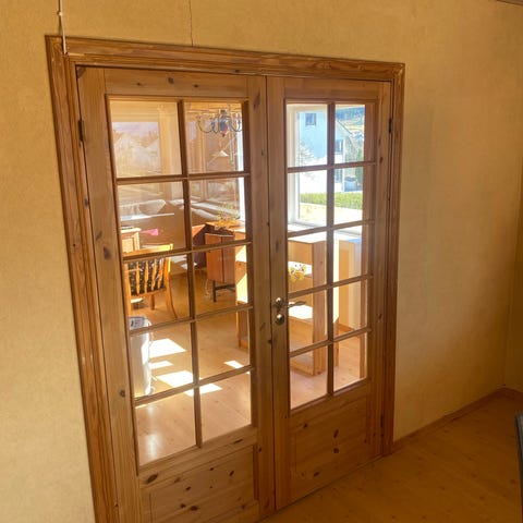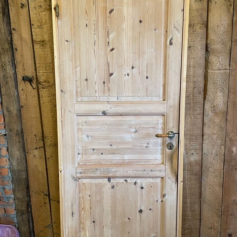 1 stk innerdør i heltre furu, med glass. Følger med karm og dørstokk.