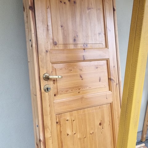 5 stk innerdører i heltre furu med profilert fylling og messinghåndtak. Ubehandlet. Følger med karm og dørstokk.