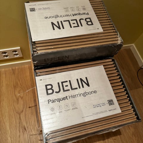 En uåpnet pakke Bjelin Woodura Planks 3.0 gulvbord pluss en løs lengde.
