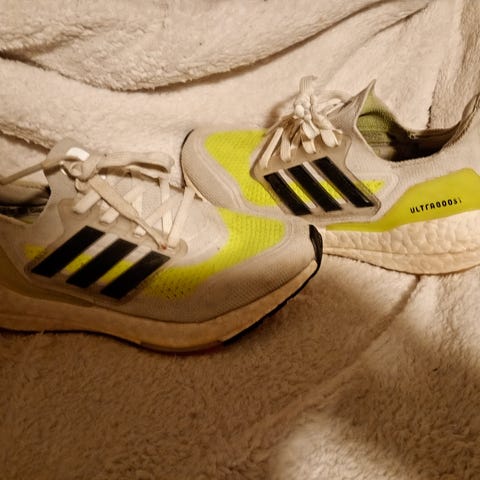 Selger et par helt nye og ubrukte Adidas Ultraboost. Dette er den perfekte løpe- og fritidsskoen, kjent for sin fantastiske komfort og demping. Skoene har en stilig flerfarget overdel i Primeknit og den ikoniske hvite Boost-sålen.