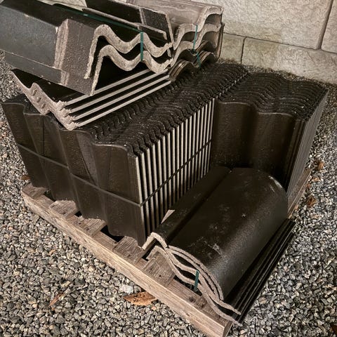 Takstein med bølgeprofil i grå farge. Steinene ser ut til å være i betong og er stablet på pall, egnet for taktekking av hus, garasje eller andre bygg.