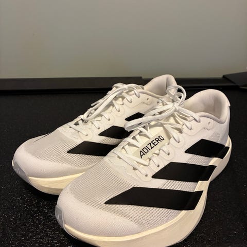 Adidas Adizero Evo SL i størrelse 39 1/3. Kjøpt nye i fjor og kun løpt ca. 6 km på mølle. Skoene er derfor i nærmest ny stand. Selges fordi de er litt store til meg. Lett og responsiv treningssko som passer både til intervaller og rolige turer.