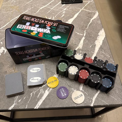 Sett med pokerutstyr for Texas Hold’em, inkludert sjetonger i flere farger, kortstokk og dealer-knapp. Leveres i eske med spilleregler og instruksjoner. Egnet for hjemmebruk ved pokerspill med flere deltakere.