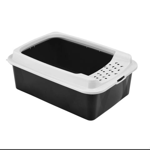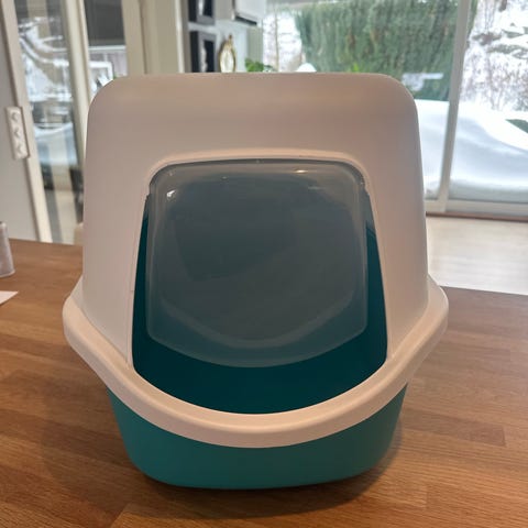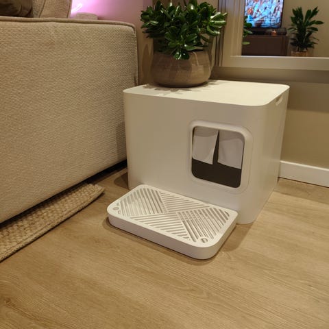 Kattedo med tak i hvit plast. Modellen har husformet overdel med sideåpning og mørk dør/sidepanel. Innvendig er det et delt område med fast underdel og perforert trinn/gitter for å samle opp sand fra potene. Nederst er det en uttrekkbar bunnskuff med flere rom for enklere rengjøring og oppsamling av kattesand. Egnet for innendørs bruk til katt.