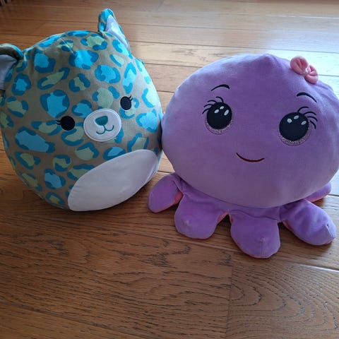 To søte Squishmallows kosedyr selges samlet. Nebbdyret Brindall (30cm) og katten Caeli (19cm) 🥰 Pent brukt og i god stand.