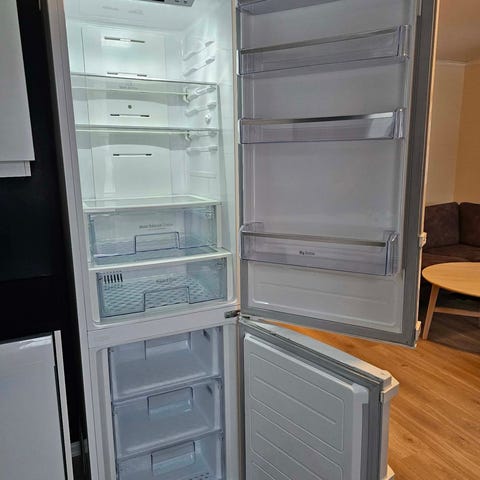 Kjøledelen har flere trådhyller i metall, en transparent grønnsaksskuff nederst og dørhyller i transparent plast til oppbevaring av flasker, kartonger og mindre varer. Frysedelen er plassert øverst. Her er det ingen hyller.