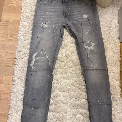 Herre jeans i størrelse 32. Modellen har smal passform med klassisk femlommers design, beltehemper og gylf med knapp og glidelås. Stoffet er denim med slitte detaljer og malingslignende effekter i blått på forsiden. Baksiden har to baklommer og lett vaskede partier. Egner seg som hverdagsbukse eller til mer uformelle anledninger.