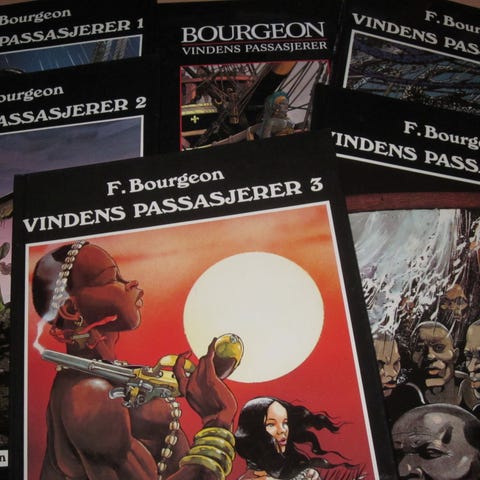 To tegneseriehefter i serien «Vindens passasjerer». Titlene er «Sort som ibenholt» og «Slangens øyne». Heftene er illustrerte og i albumformat, med fargerike omslag. Egner seg for lesere som samler på eller er interessert i fransk-belgiske tegneserier og eventyrhistorier i tegneserieform.