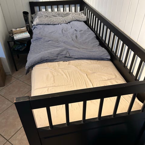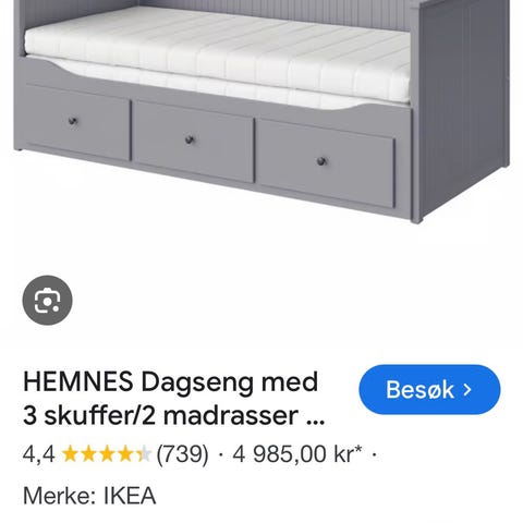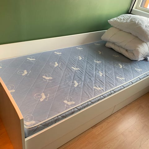 IKEA dagseng med tre uttrekksskuffer under liggeflaten. Sengen er hvit og har rette linjer og høy rygg- og sidekant, slik at den også kan brukes som sofa på dagtid. Madrass følger med på bildene og viser omtrentlige mål med målebånd. Passer som enkeltseng i soverom, gjesterom eller barnerom, og gir ekstra oppbevaringsplass i skuffene under sengen.