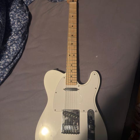 (Selger fordi dette var et impuls kjøp og jeg tror jeg kun har øvd på den rundt 5 ganger eller noe sånt) Squier Stratocaster elektrisk gitar i svart finish med hvit plekterplate. Gitaren har tre single-coil pickuper, femveis pickup-bryter, volum- og tonekontroller samt tremolo-bro. Hals og gripebrett er i lyst treverk med 6 stemmeskruer på hodet. På bildene følger det også med en forsterker og en svart Fender gigbag, samt instrumentkabel. Egner seg til øving hjemme, bandrom og generell elgitarbruk. (Instrument kabel er litt vrien men så lenge man tar en spesifikk ende inn i gitaren og ikke ampen funker den helt fint)