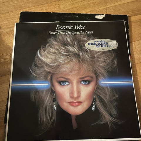 Bonnie Tyler Faster Than The Speed Of Night LP vinylplate. Studioalbum utgitt på CBS Records, levert med originalt plateomslag. Standard 12" svart vinyl med trykt etikett. Omslaget viser albumtittel og artist på forsiden, og låtliste med krediteringer på baksiden. Kjøpt brukt.