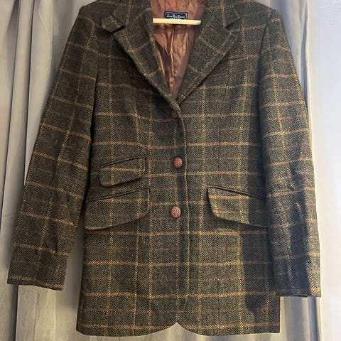 Jean Paul Emanuelle blazer for dame i størrelse S. Blazeren er i bruntonet mønstret ullstoff. Ytterstoffet er 100 % ull, med glatt fôr i polyester og viskose.