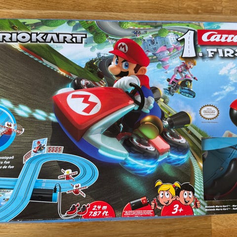 Super Mario Mario Kart Luigi lekebil med bananskall. Figuren viser Luigi i grønn gokart fra Mario Kart-serien, sammen med et gult bananskall-tilbehør. Lekebilen er laget som en figurkjøretøy-leke til barn og kan brukes til rollelek og lek inspirert av Mario Kart-universet. Leveres i original eske som vist på bildene.