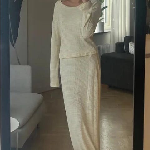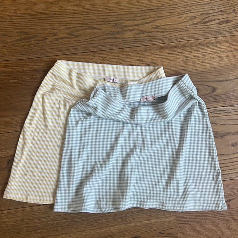 Nelly stripete hvitt/gult maxiskjørt for dame i størrelse S. Laget i viskose. Bra med stretch og behagelig på