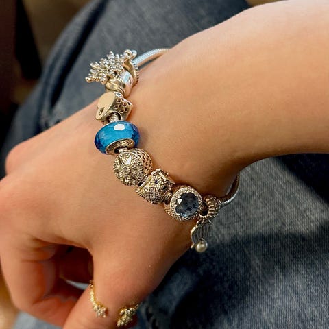 Pandora armbånd i sølv. Armbåndet har slangekjede-design med lås og seks ulike charms. Passer som hverdagsarmbånd eller til mer pyntede anledninger ✨
