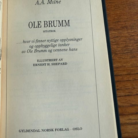 A.A. Milne Ole Brumm sitatbok bok. Norsk utgave med sitater fra Ole Brumm-universet. Illustrert av Ernest H. Shepard. Inneholder korte tekster og illustrasjoner med kjente figurer fra historiene om Ole Brumm. Egner seg som lese- og sitatbok for både barn og voksne som liker klassiske barnebøker.