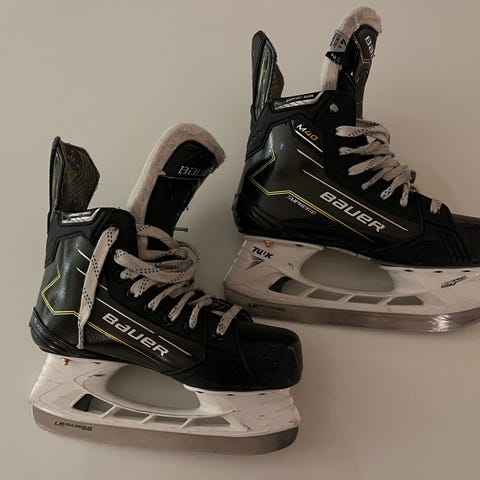 Jofa ishockeyskøyter i størrelse 45. Skøytene er i svart farge med hvite lisser og hvit skøytestålholder. Egnet for ishockey og annen bruk på is. Passer for voksne med skostørrelse 45.