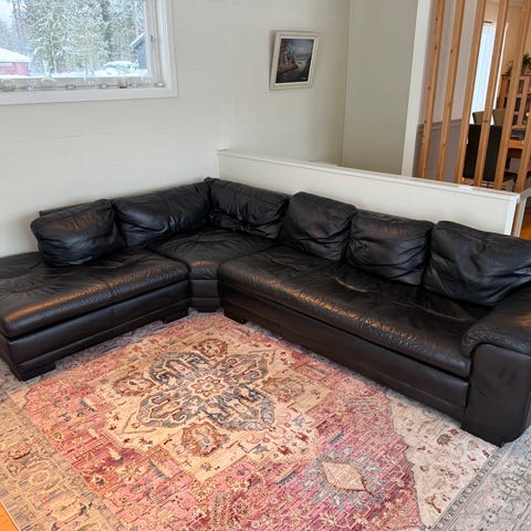 Svart stressless stol i skinn. Veldig god å sitte eller ligge i.