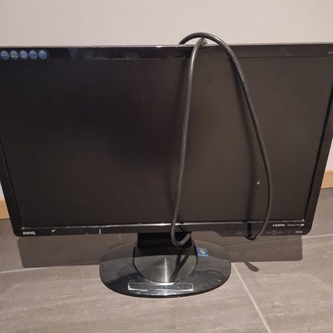 Skjermen har innebygd fot og strømtilkobling, som vist på bildene. Passer til bruk med stasjonær PC eller som ekstra skjerm til bærbar PC, avhengig av tilgjengelige tilkoblinger på enheten den kobles til.