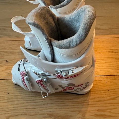 Rossignol Powah alpinstøvler i hvit farge. Støvlene har flere spenner med rødt og hvitt prikkemønster for justering av passform. Mykt, polstret innerfôr gir komfort og støtte. Sålen er merket med lengde 275 mm. Egnet til bruk med vanlige alpinbindinger på ski.