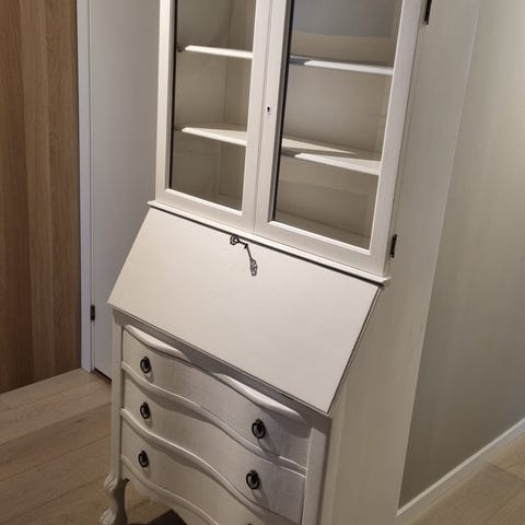 Sjenk med tallerkenhylle til salgs. Gammelt, heltre møbel. Høyde 191 cm, dybde 50 cm og bredde 137 cm.