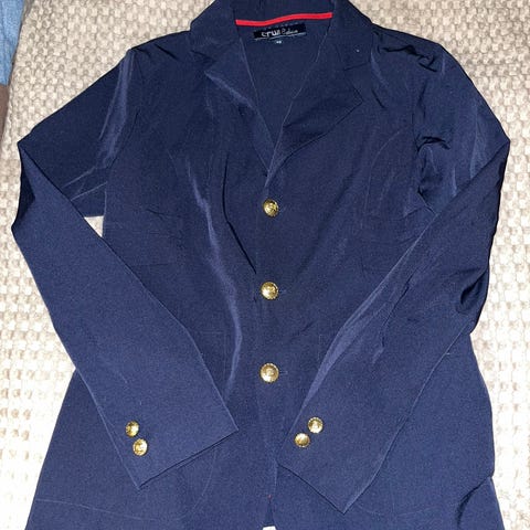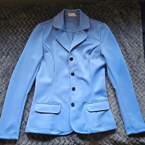 CRW stevnejakke i blå farge i størrelse 36. Jakken har knappelukking foran med flere knapper og klaffelommer. Figursydd passform med sømmer bak for bedre fasong. Brukt 1 gang