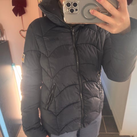 Svea Simplicity dunjakke for dame i størrelse M (litt små i størrelse). Jakken er blå og vattert med dun. Den har ståkrage, hel glidelås i front og to sidelommer med glidelås. Elastisk kant nederst gir en mer tettsittende passform. Jakken har Svea-logo på brystet og flaggpatch på ermet. Nederst på den ene armen er det et lite hull som kan lett repareres.