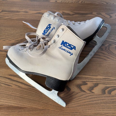 Kosa Harmony skøyter for barn i størrelse 33. Klassiske hvite skøyter med snøring og sort hæl. Blad i metall med festeskruer under sålen. Egnet til generell skøytebruk på isbaner og uteis for barn i aktuell skostørrelse.
