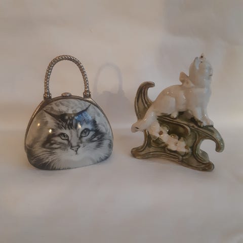 Nydelig katt stående på et lite fat , er til oppbevaring av smykker og ringer. Den er laget i sølvplett og fremstår som veldig vakker. Fatet er ca 8 cm. og høyden på katten er ca 9 cm.