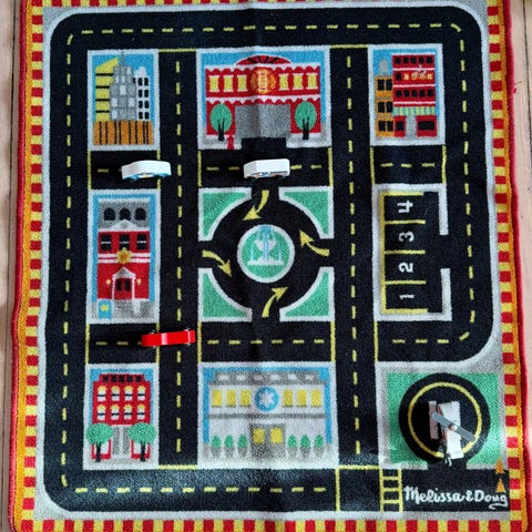 Melissa & Doug bil garasje, leke med tre porter i ulike farger og tilhørende nøkler. Settet inkluderer 2 små kjøretøy som kan parkeres i garasjen. Portene åpnes med hver sin nøkkel, noe som gir mulighet for enkel sortering og nøkkelmatching. Passer som innendørs lek for barn som liker biler og garasjer.