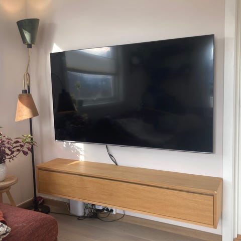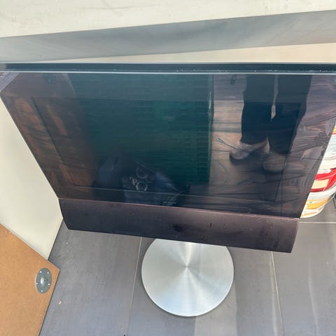 Bang & Olufsen TV med innebygde høyttalere og karakteristisk metallfront med perforert mønster. TV-en står på et stativ med to skrå ben i metall. Egnet som TV eller skjerm i stue eller andre rom der det er behov for bilde og lyd i ett produkt.