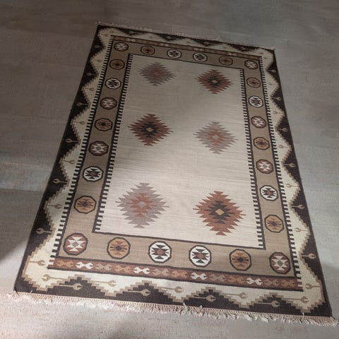 Teppet er pent og velholdt og har hengt på en vegg. Det er noen små frynser på sidene, se bildet.